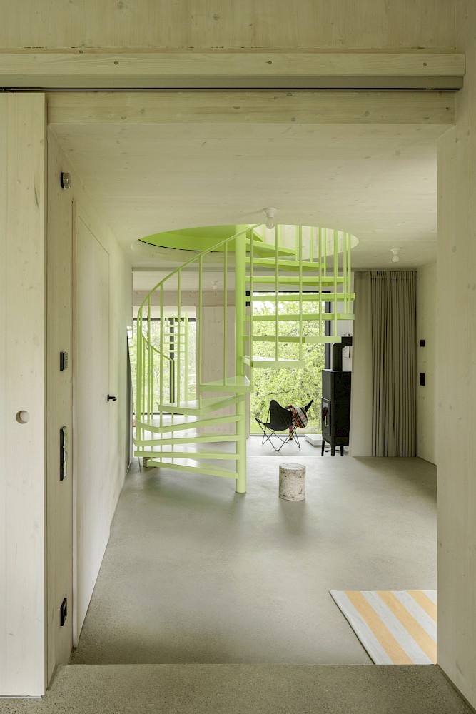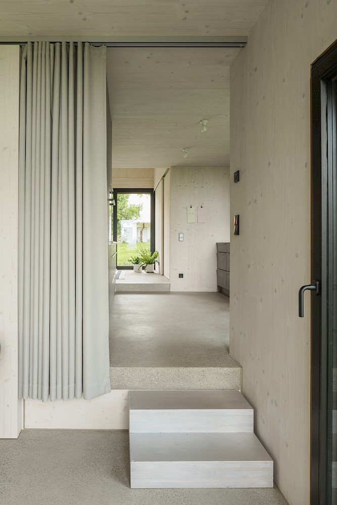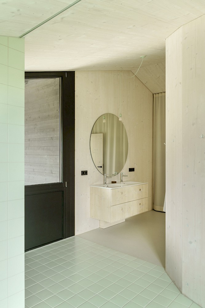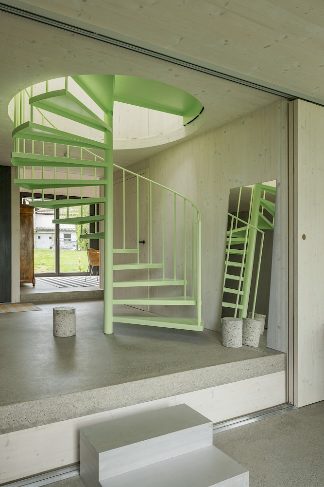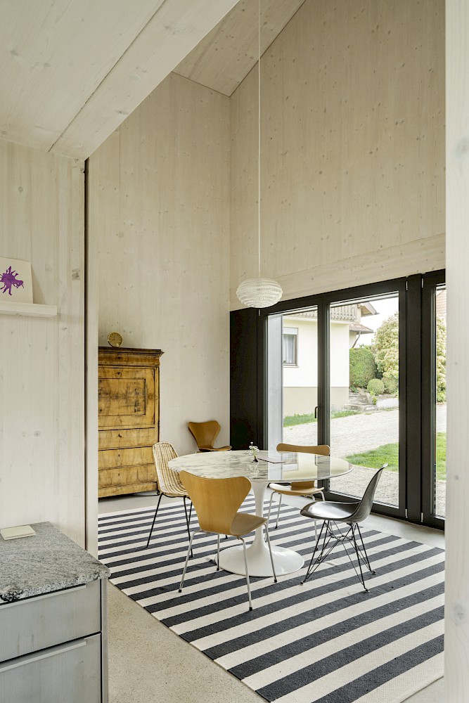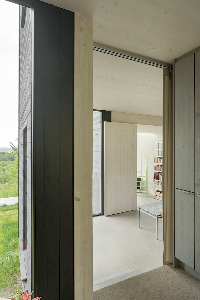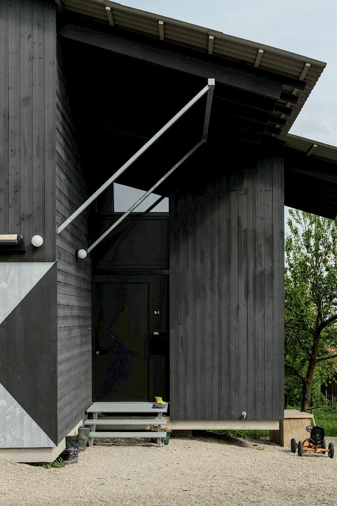 Die verwendeten Materialien sind der Umgebung entliehen und spiegeln den pragmatischen ländlichen Kontext wieder, greifen bestehende Stilmerkmale auf und interpretiert diese.Durch die einfache Bauweise mit wenigen Konstruktionsschichten werden die Oberflächen überwiegend roh belassen und erhalten durch eine Lasur oder Ölung eine Veredelung und Sichtbarkeit. Die massiven Holzwände aus Fichte werden als fertige Wandoberflächen belassen und lediglich weiss lasiert, der Holzbau bleibt somit subtil wahrnehmbar. Der Zementestrich am Boden ist geschliffenen und bleibt ohne weiteren Belag. Die sägerauen Bretter der Fassade sind schwarz gestrichen und zitieren mit der schwarzen Welleindeckung die landwirtschaftlichen Scheunen.