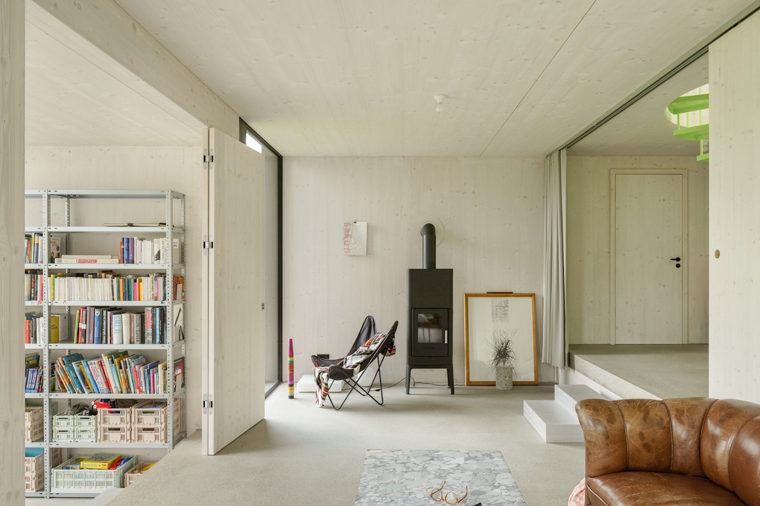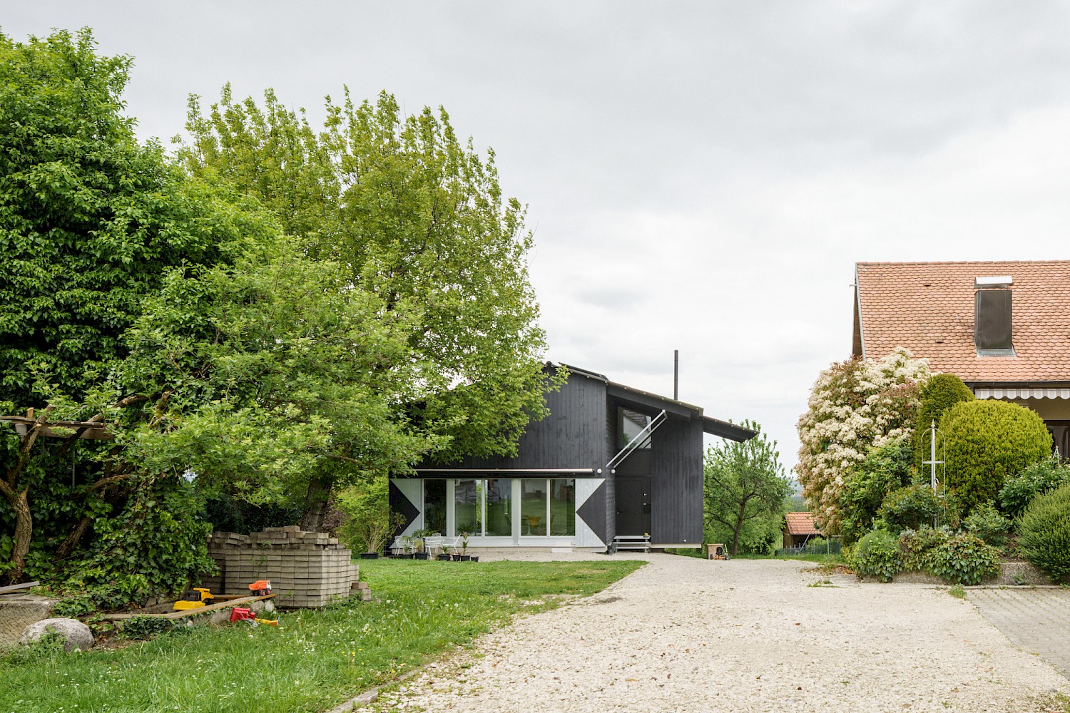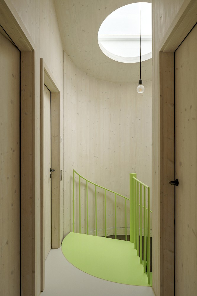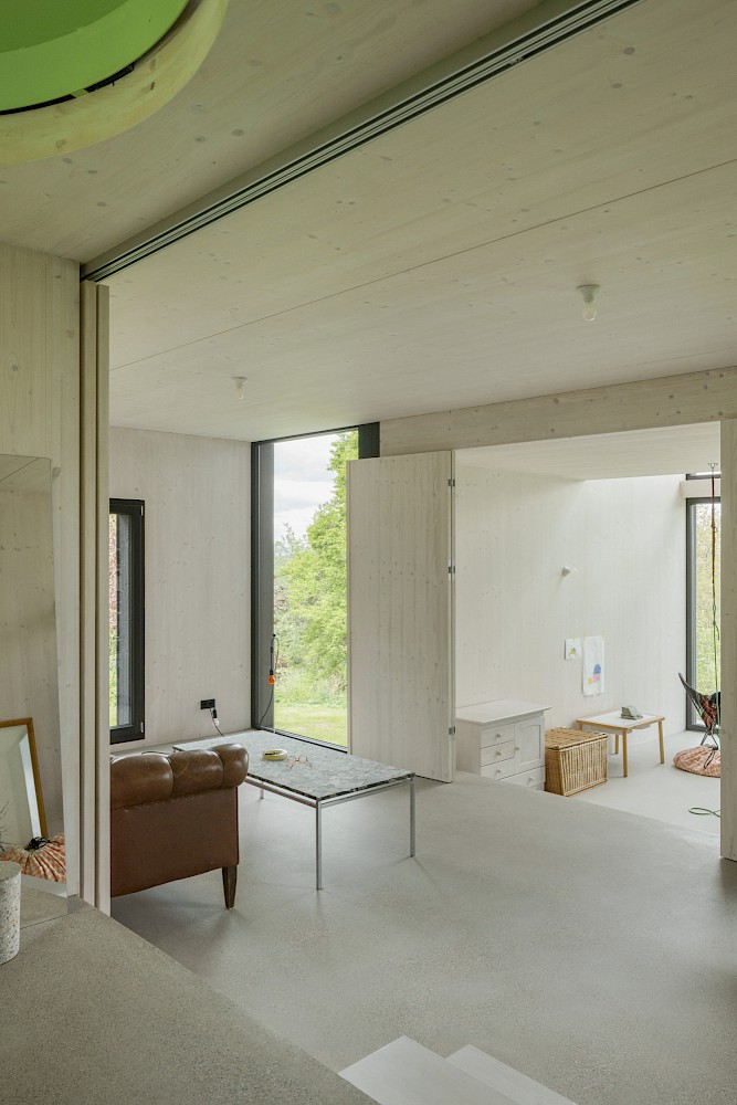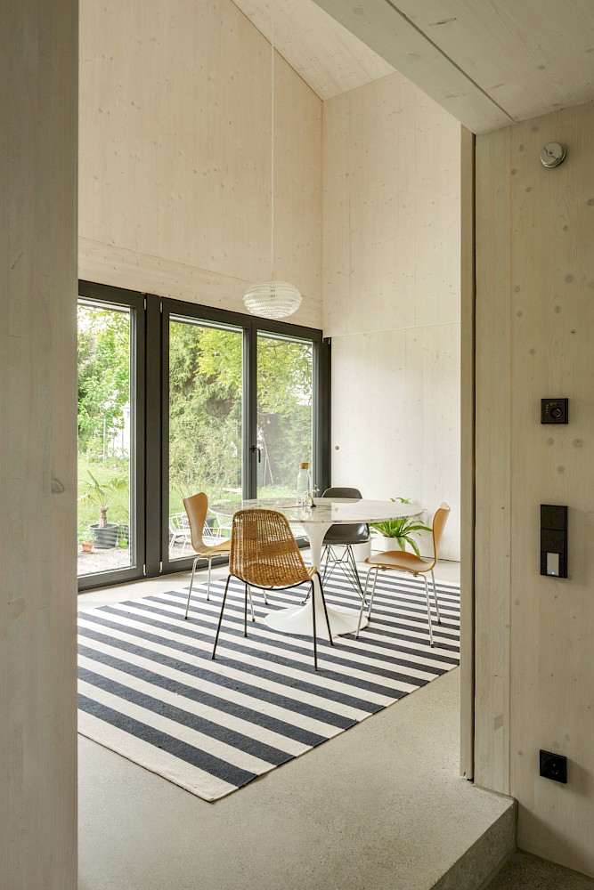 Die verwendeten Materialien sind der Umgebung entliehen und spiegeln den pragmatischen ländlichen Kontext wieder, greifen bestehende Stilmerkmale auf und interpretiert diese.Durch die einfache Bauweise mit wenigen Konstruktionsschichten werden die Oberflächen überwiegend roh belassen und erhalten durch eine Lasur oder Ölung eine Veredelung und Sichtbarkeit. Die massiven Holzwände aus Fichte werden als fertige Wandoberflächen belassen und lediglich weiss lasiert, der Holzbau bleibt somit subtil wahrnehmbar. Der Zementestrich am Boden ist geschliffenen und bleibt ohne weiteren Belag. Die sägerauen Bretter der Fassade sind schwarz gestrichen und zitieren mit der schwarzen Welleindeckung die landwirtschaftlichen Scheunen.