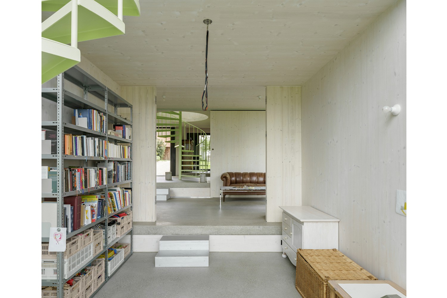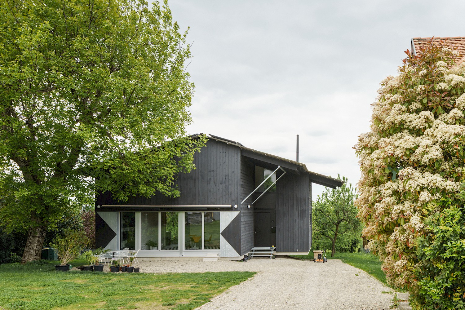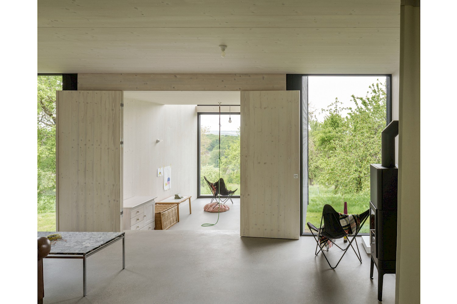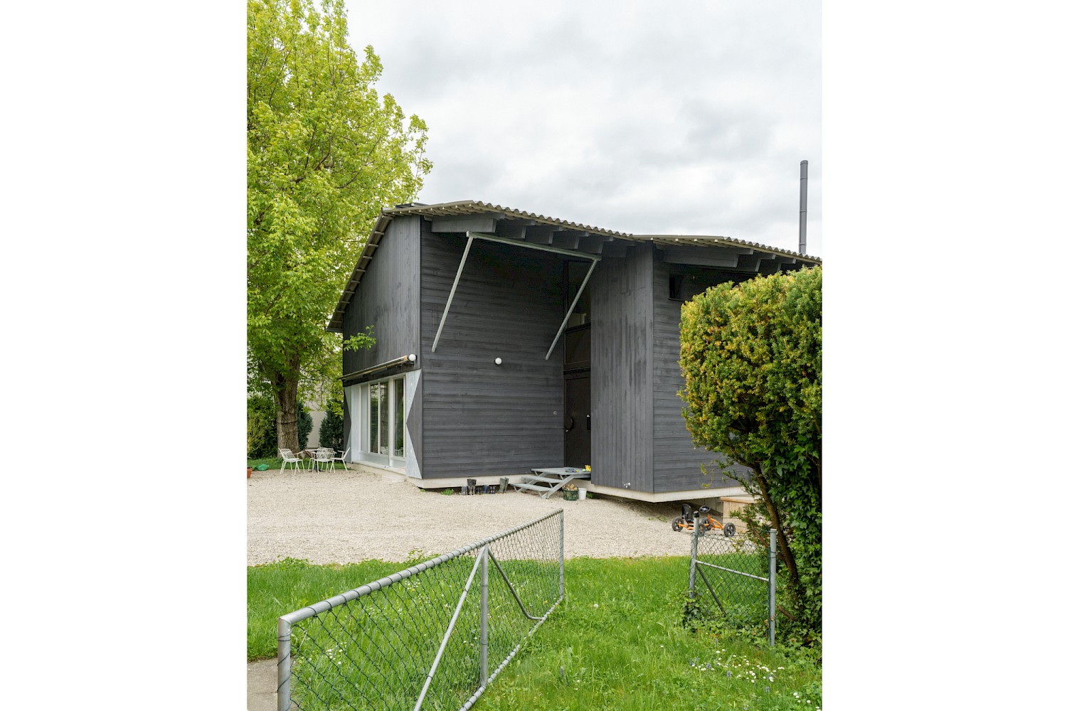 Die verwendeten Materialien sind der Umgebung entliehen und spiegeln den pragmatischen ländlichen Kontext wieder, greifen bestehende Stilmerkmale auf und interpretiert diese.Durch die einfache Bauweise mit wenigen Konstruktionsschichten werden die Oberflächen überwiegend roh belassen und erhalten durch eine Lasur oder Ölung eine Veredelung und Sichtbarkeit. Die massiven Holzwände aus Fichte werden als fertige Wandoberflächen belassen und lediglich weiss lasiert, der Holzbau bleibt somit subtil wahrnehmbar. Der Zementestrich am Boden ist geschliffenen und bleibt ohne weiteren Belag. Die sägerauen Bretter der Fassade sind schwarz gestrichen und zitieren mit der schwarzen Welleindeckung die landwirtschaftlichen Scheunen.