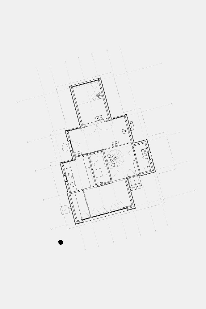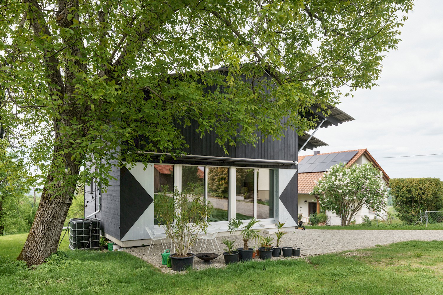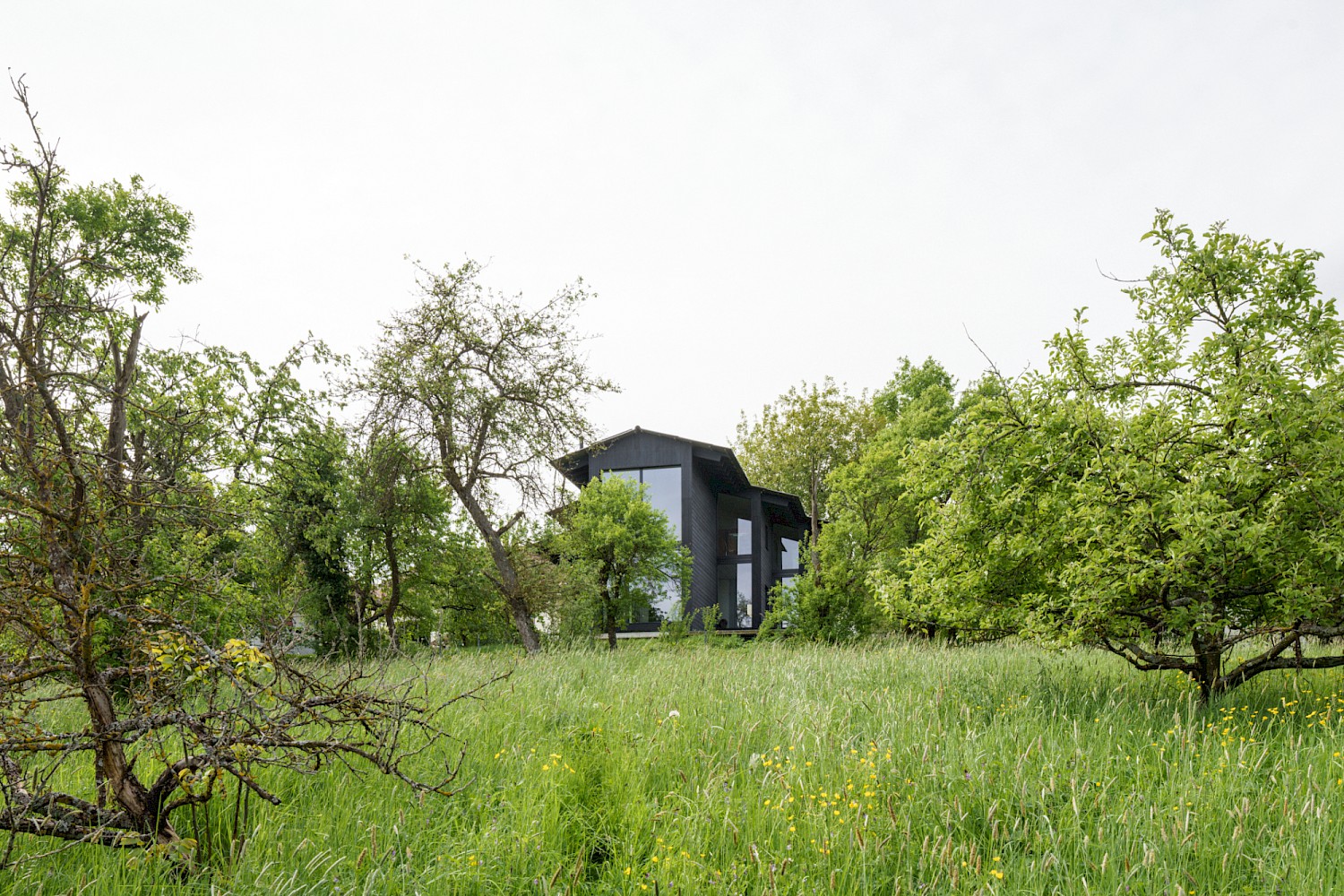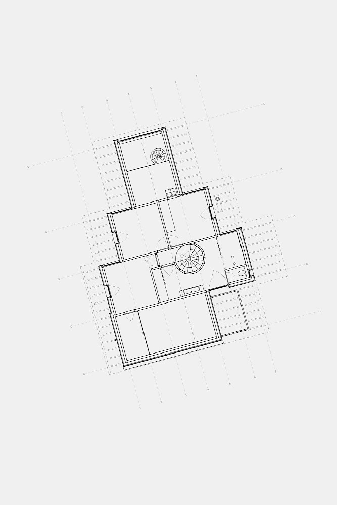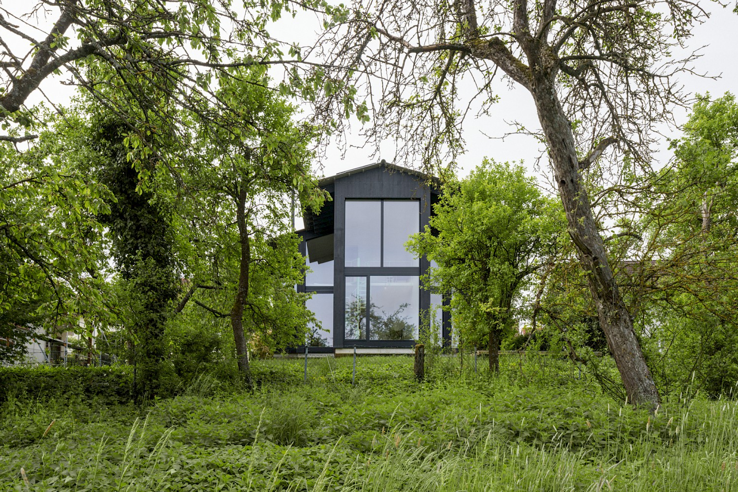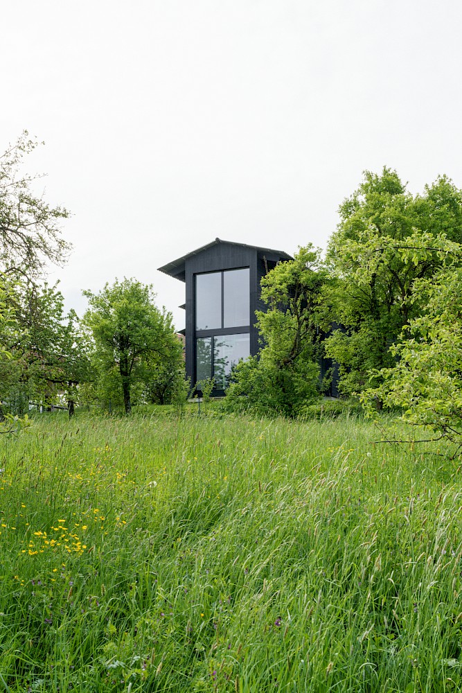 Das Grundstück befindet sich in Grafenberg, einem Dorf in der Nähe von Stuttgart. Der Charakter des Ortes wird geprägt durch den Typus der Dorfstrasse, an dem sich die Typologie der Scheune (Wirtschaftshaus mit integriertem Wohnhaus) aufreiht. In der zweiten Reihe wurden hinter der Dorfstrasse weitere ländliche Typologien wie Wirtschaftsbauten, Bienenhäuser, Backhäuser, Kapellen und Nutzbauten errichtet. In der jüngeren Geschichte des Ortes wurden zunehmend Wohnhäuser gebaut, die mit der ursprünglichen dörflichen Struktur und den Typologien nichts zu tun haben und zu einer Zersiedelung des Ortes führen. Um dem entgegenzuwirken, bildet das Volumen städtebaulich einen Hof und schafft damit die Beziehung zu den bestehenden Gebäuden der Dorfstruktur und einen neuen halböffentlichen Raum in zweiter Reihe.