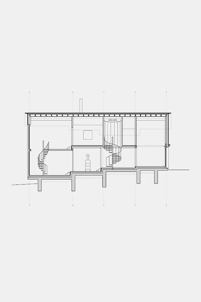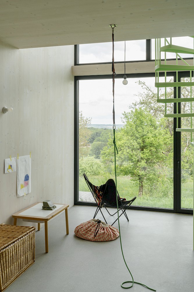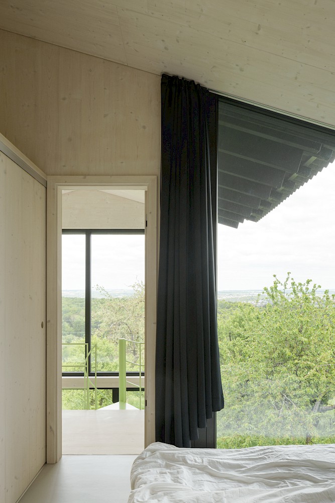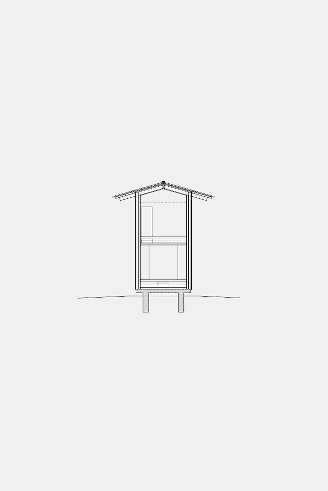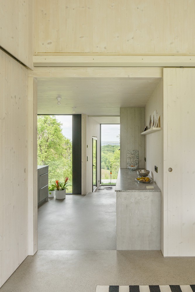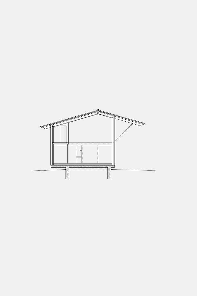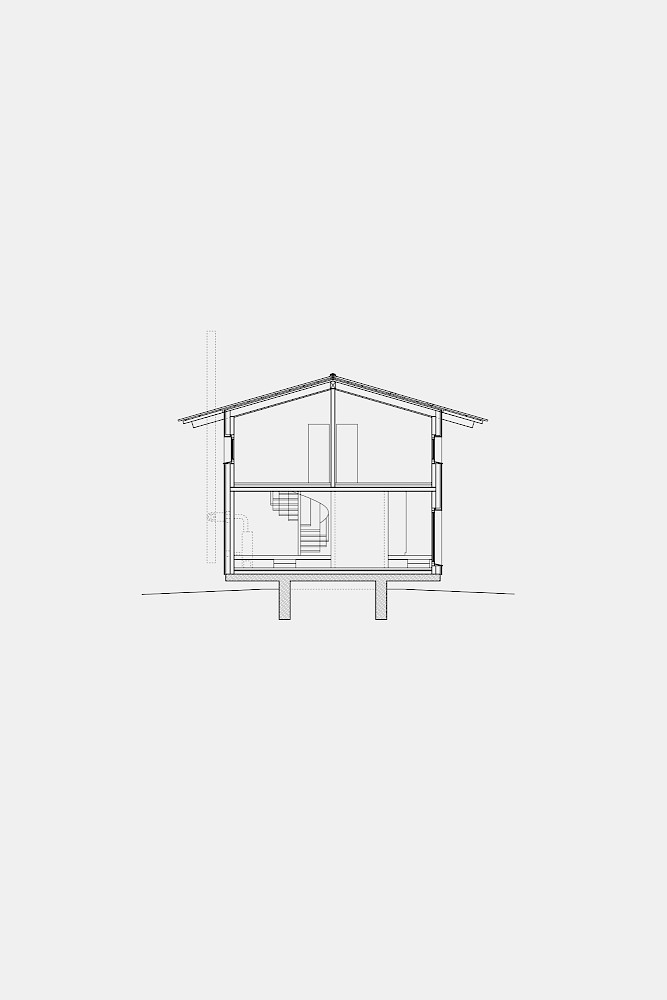 Die Idee des Baukörpers ist es vier Schnitte der vorgefundenen Typologien aneinanderzureihen. Diesen vier Schnitten wird eine entsprechende Nutzung zugewiesen. So bekommt das nördliche Atelier die Form einer Kapelle. Der Essraum in Form einer Scheune wird nach Süden an den Hof orientiert, um an das Dorf anzuknüpfen. Die Aussenfassaden der vier Schichten verjüngen sich hangabwärts und ermöglichen den maximalen Lichteinfall von Norden und den Ausblick aus jeder Raumschicht auf das Tal. Im Inneren des Hauses faltet sich die Bodenplatte hangseitig nach unten und erzeugt im Erdgeschoss eine artifizielle Landschaft. Die Aussenwände werden als tragende Massivholzscheiben errichtet, zusammen mit dem flachgeneigten Dach, welches die Baukörper zusammenfasst, wird der Charakter eines ländlichen Wirtschaftgebäudes unterstützt.